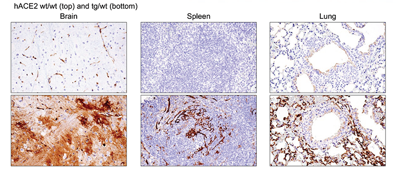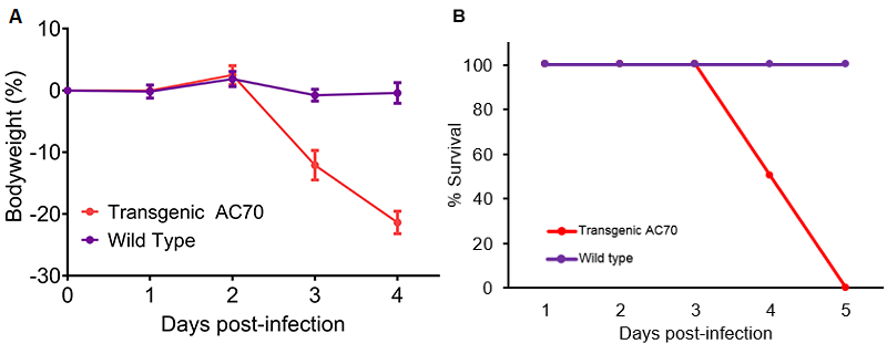 The hACE2 AC70 Mouse was generated by Kent Tseng et al. at the University of Texas Medical Branch at Galveston via pronuclear microinjection of a transgene into C57BL/6J x C3H/HeJ F1 zygotes. The transgene consists of human ACE2 cDNA under the control of the CAG promoter, consisting of the cytomegalovirus immediate-early enhancer and the chicken beta-actin promoter with the rabbit globin splicing and polyadenylation site. Multiple founder lines were established, including the AC70 line, which was subsequently backcrossed to C57BL/6. Taconic received the line in 2020, and the line was expanded via IVF rapid expansion using C57BL/6NTac females and hemizygous males. Taconic maintains breeding using C57BL/6NTac females by hemizygous males and/or hemizygous females by C57BL/6NTac males.