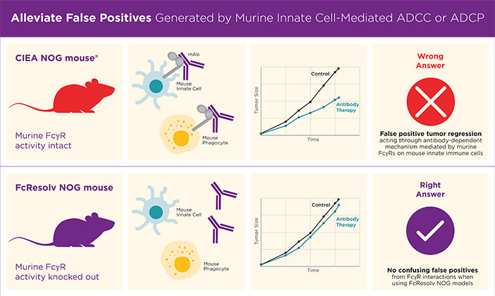 Researchers who work with antibody-based therapies find that murine Fc gamma receptors (FcγRs) can confound preclinical study results, causing false positives or false negatives that lead to incorrect conclusions and derail drug discovery. FcResolv® NOG models lack FcR expression to provide clarity in antibody-based drug studies, offering greater confidence and more translatable data while utilizing fewer resources.