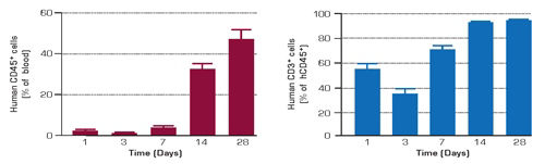 Figure 1: Human CD45+ cells were enumerated by flow cytometry at daily intervals follow PBMC engraftment. Significant engraftment was observed after 14 days. The majority of human CD45+ cells are CD3+ T cells.