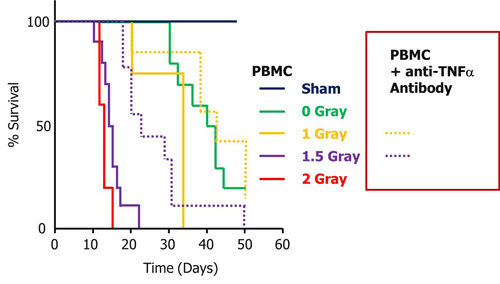 Figure 2: Irradiation exacerbates GvHD in PBMC engrafted NOG mice. Survival curves for PBMC engrafted NOG mice at increasing doses of radiation with, or without pre-treatment with anti-TNFa blocking antibody.
