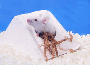 With regards to bedding, most standard cages contain wood, paper, or corn cob-based bedding. It is important to remember, however, that many conventional types of bedding material do not allow rodents to express nesting behavior when used alone since they cannot be used to build nests. Bedding types such as Alpha-Dri Plus contain mini paper twists which provide nesting material that is beneficial to the mice. The Bed-r'Nest, which comes pre-packaged in 4 grams or 8 grams sizes, is designed to resemble thin strands or grass similar to those found in nature. It is easy to dispense, dust-free, and provides adequate thermoregulation once shredded apart. Compressed cotton nesting squares are another commonly used form of nesting material