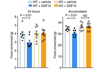 While wild type mice administered GDF15 lose weight, Gfral knockout mice are resistant to the effects of GDF15. Figure from Hsu, J-Y, et al1.