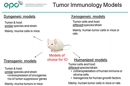 Standard xenograft models, in which a human tumor is transplanted into an immunodeficient host, have limited utility for IO studies, as the appropriate immune cells are not present in the host. The current models of choice for IO research include:- Syngeneic models (mouse tumor transplanted into mouse of same strain background)