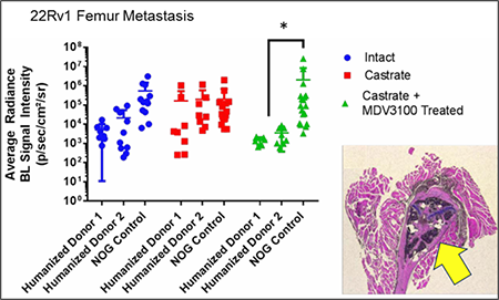 We observed reduced metastatic growth following enzalutamide treatments in two different cohorts of huNOG mice, each produced with human stem cells from a different human donor. In a sense, each cohort acts as an avatar for the donor's immune system and for modeling how it might interact with prostate cancer. Our results align with recently published clinical data that suggests enzalutamide prevents metastatic growth in patients, and further suggest that anti-metastatic effects from enzalutamide could be mediated by the immune system.