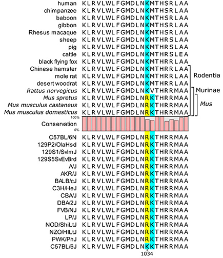 NLRP12 (Nod-like receptor pyrin domain containing 12) is a component of the innate immune system that regulates immune cell trafficking and cytokine production. The C57BL/6J mutation (G to A at position 3,222,537, Chr. 7) causes an amino acid substitution in NLRP12 (arginine to lysine at residue 1034) in a conserved leucine rich repeat (LRR) domain which is putatively important for protein-protein interactions.The affected LRR domain from NLRP12 is highly conserved among mammals. There are two important exceptions within the Mus genus: