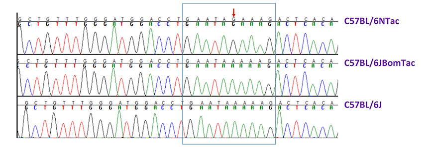 The mutation is specific to C57BL/6J and related substrains, and is not present in C57BL/6N strains. This suggests that the C57BL/6J mutation arose after the separation of the C57BL/6J and C57BL/6N substrains in 1951.Our data show that a related C57BL/6J substrain, C57BL/6JBomTac, also carries this mutation, indicating that this mutation arose prior to 1971 when this substrain separated from the ancestral C57BL/6J.