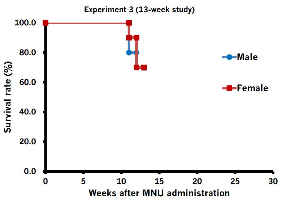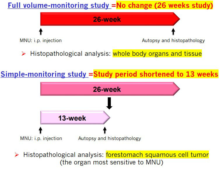 Our background and published data revealed that forestomach squamous cell papilloma or carcinoma was detected in over 80% of cases within 12 to 13 weeks following MNU administration. Consequently, we hypothesized that a simplified monitoring study could be effectively completed within a 13-week period.