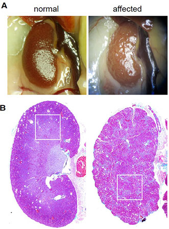 The kidneys of immunodeficient mice infected with MKPV appear pale and shrunken on gross necropsy. Histology reveals significant fibrosis. Source: Roediger et al. Cell 20181