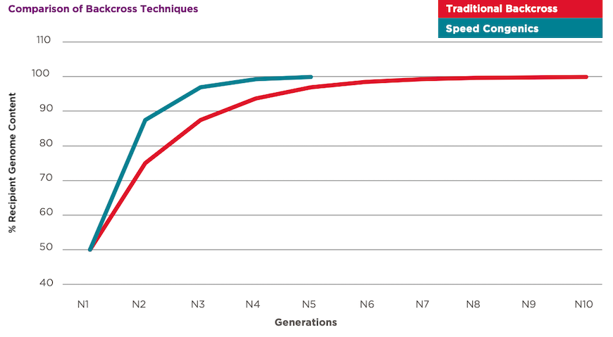 As shown below, when comparing traditional backcrossing to speed congenics, the desired strain is achieved in less than half the time through the speed congenics process vs. traditional backcrossing.