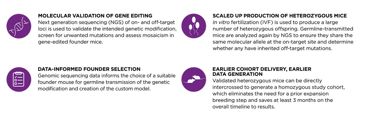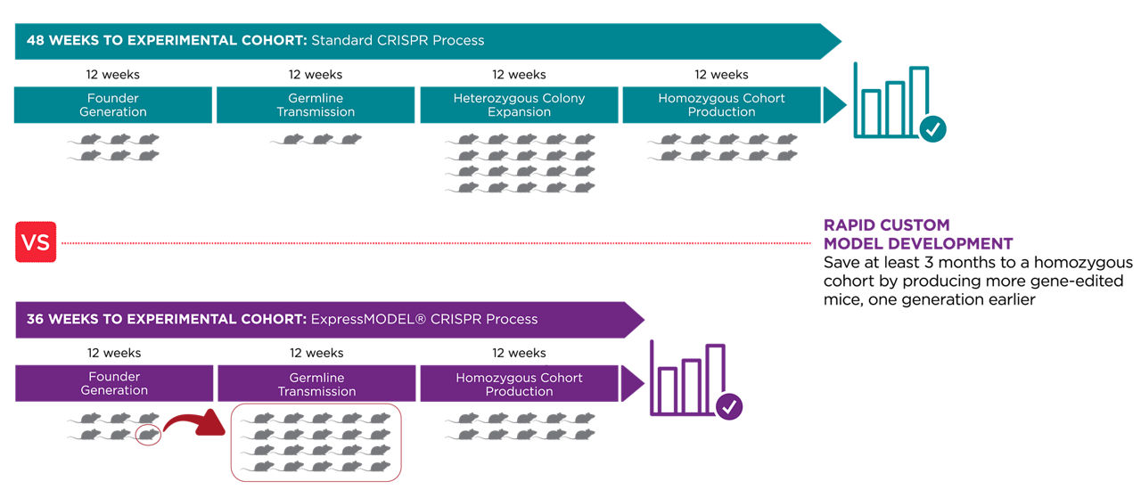 CRISPR/Cas9 gene editing has evolved into a rapid and efficient model generation method for an array of genetic modifications. However, the potential for unwanted mutations at off-target sites in the genome when using this technology, which may lead to confounding experimental results, remains a concern for study design. Consequently, the uncertainty of obtaining a suitable genetic model using the CRISPR/Cas9 system can diminish its speed advantage over other traditional methods. With the ExpressMODEL® CRISPR platform, we address off-target risks early, utilizing NGS to provide robust characterization of both on- and off-target loci and an assessment of genetic mosaicism in founder mice. These analyses inform the selection of the most suitable founder mouse for germline transmission, which de-risks inheritance of the correct genetic modification and enables simultaneous IVF expansion of the genetic line. Germline transmission by IVF not only provides scalability of the number of heterozygous mice produced, but also assignment of a Taconic International Health Monitoring System (IHMS) health standard. By delivering an appropriately sized cohort of age-matched, off-target analyzed mice with a defined health standard, Taconic's ExpressMODEL® CRISPR platform can accelerate downstream breeding programs and shorten the time to a homozygous study cohort by at least 3 months compared to a standard CRISPR/Cas9-based model development program. And by monitoring parameters critical to success throughout the model generation process, the ExpressMODEL® CRISPR option can save time and money through allowing researchers to make project and program decisions earlier.