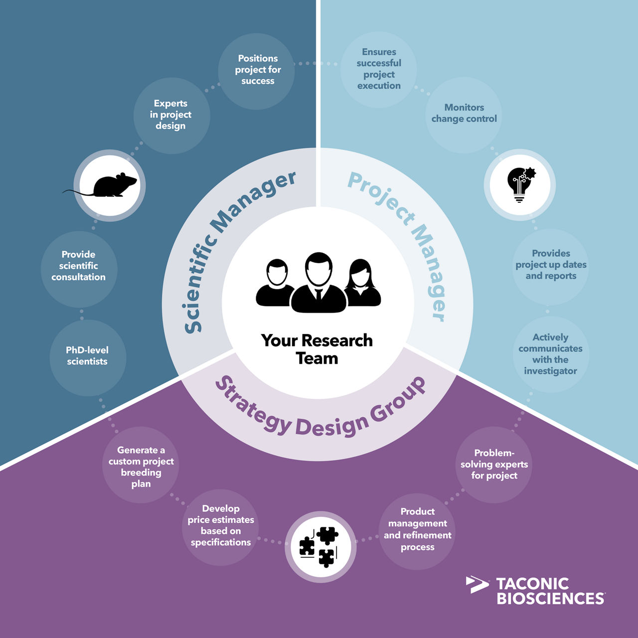 Taconic's ecosystem of support including Scientific Program Managers, Project Managers, and Application Scientists are assigned from the moment we start planning your colony and stay with the project until completion.
